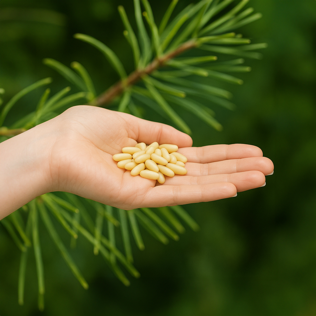 The pine seeds are harvested and cold pressed to extract the oil. Harvesting is done in small batches in order to guarantee the sustainability of (re)production of pine cones and pine seeds.